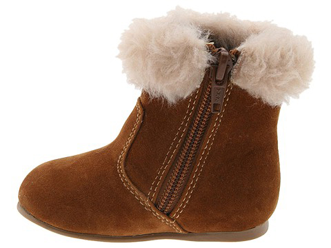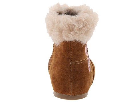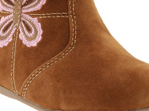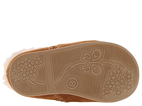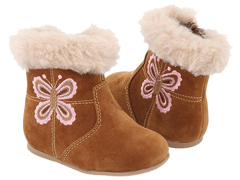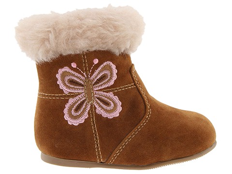 Synthetic leather upper with faux fur trim and embroidered butterfly.